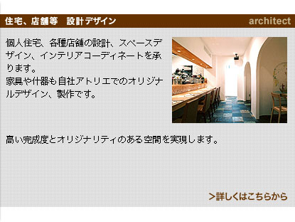 :住宅・店舗等の設計、スペースデザイン。オリジナル家具のデザイン、製作。