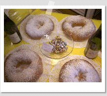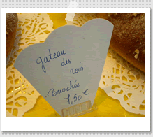 私はお菓子の専門家ではないので、あまり詳しくは知らないのですが身近でみるお店には2種類の王様ケーキが置いてあるところが多いのです。1つはブリオッシュの生地をまるい大きなドーナツ型にしたもの。上にはみんなの大好きなお砂糖が雪のように積もっています。そしてもう1種類はパイ生地で作られたもの。こちらのほうがより焼き菓子というニュアンスが強いですね。小麦粉もお砂糖もバターも素晴らしいフランスなので昔ながらの素朴なお菓子ですがほんとうに美味しいものです。 |