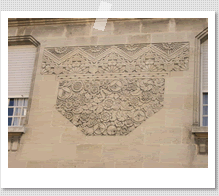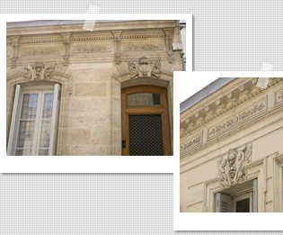 こちらの建物は石で出来ていることが多いのですが、表の壁にはアクセサリーとしていろいろな彫刻やレリーフが施されています。最初の画像はアールデコのデザインでお花のような幾何学模様が大胆に彫られています。