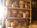 りの水を入れるもので、バーで使われていた分厚いガラス瓶です。黄色いつぼはオイルや蜂蜜をはじめとするいろいろな食品のストックを入れていた保存用の陶器、ひとつひとつに違った表情があってうっとりするほど美しいオブジェです。 |