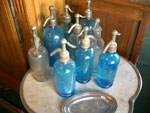 物や鉄のさまざまな道具、素敵な食器やグラス、昔の映画に出てくるような洗い込まれたリネン類、たくさんあるブルーのボトルはシフォンと呼ばれるガス入
